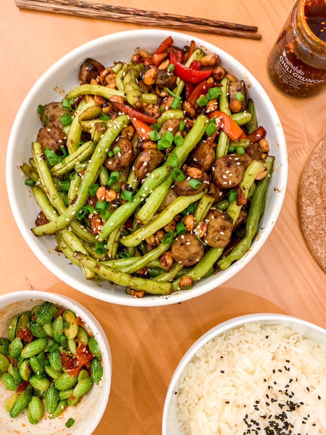 Next, add in washed and trimmed green beans, sliced bell pepper. Season with salt, pepper, and creole seasoning. Sauté for a few minutes until pepper begins to soften. Then, add in some soy sauce, rice wine vinegar, and sesame oil. Add in peanuts here if desired as well. Sauté for a few more minutes until green beans are desired tenderness.
