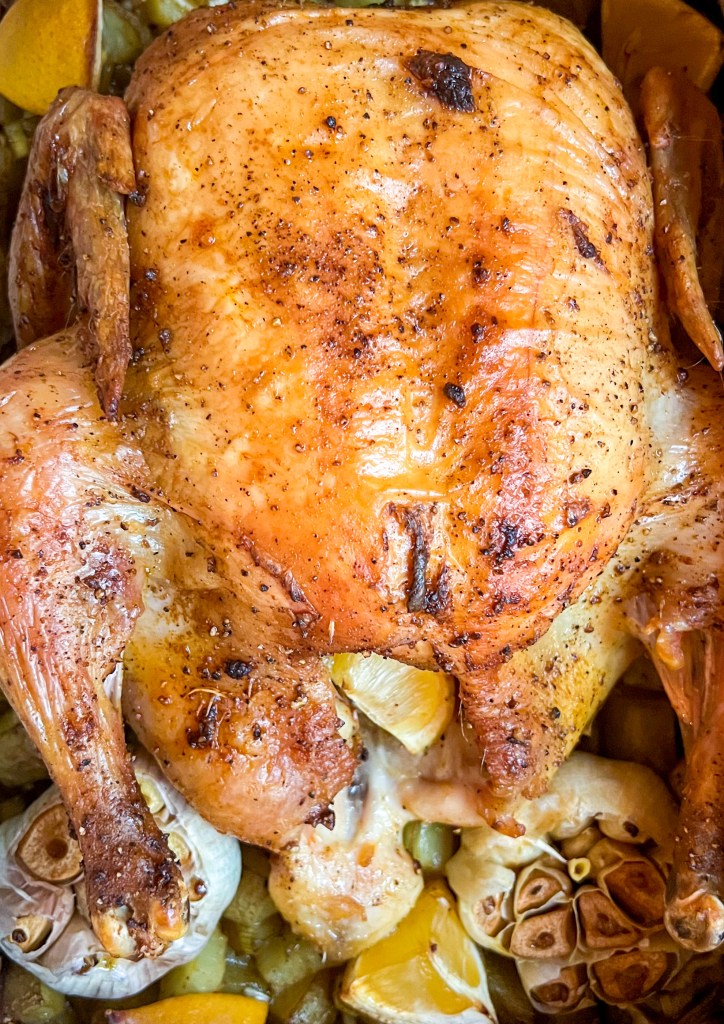 Salt whole raw chicken 24 hours in advance. Coat with olive oil, salt, pepper, & smoked paprika. Roast over a bed of seasoned potatoes & leeks (add whole garlic & lemon as desired) in a 425°F oven for 1 hour.