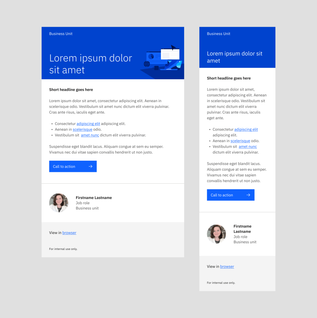 Using IBM’s Carbon Design System, I created a series of templates for use in internal business communications. I worked closely with our design systems team as well as our communications team to ensure all messaging would come across clearly and efficiently.